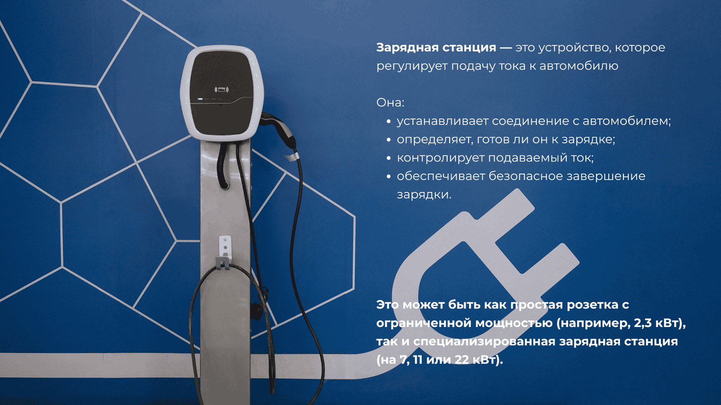 Зарядка электромобиля — это процесс передачи электрической энергии из внешнего источника в аккумуляторную батарею транспортного средства. В основе этого процесса лежит контролируемый электрический обмен между сетью питания (или генератором, например солнечной станцией) и электромобилем.