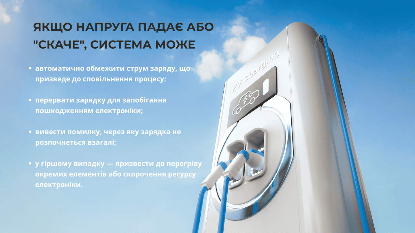Нестабільність живлення у вигляді коротких “просідань”, імпульсних зникнень напруги або повних вимкнень світла також небезпечні. Особливо це актуально в нічний час, коли авто зазвичай ставлять на зарядку без нагляду.